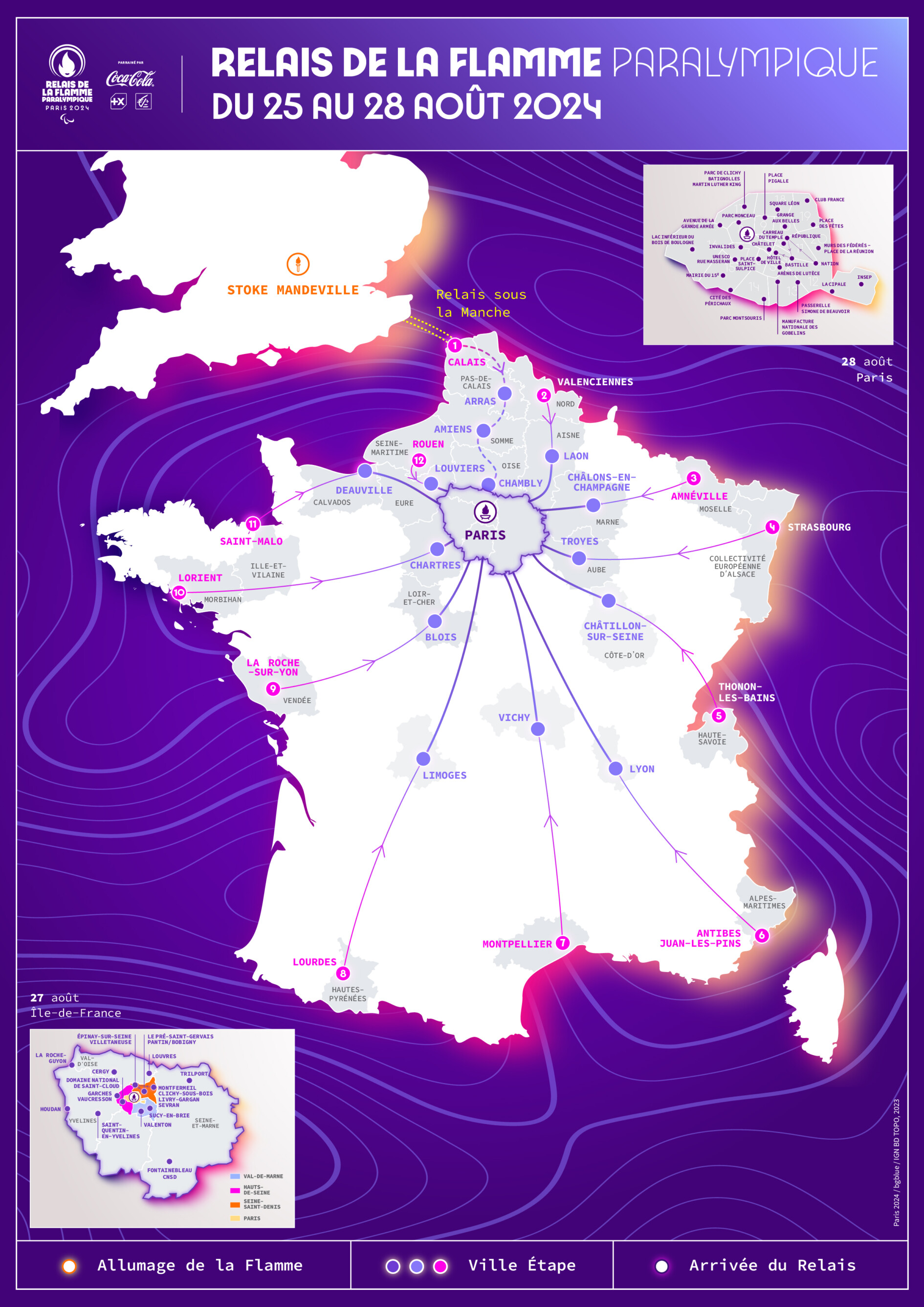 Le relais mettra la France au diapason des Jeux Paralympiques avec 1 000 porteurs de la flamme qui se relaieront pendant 4 jours dans plus de 50 villes. Les 12 flammes emprunteront chacune leur propre voie pour traverser 100% des régions hexagonales et converger vers Paris. Le parcours du relais, co-construit avec l’expertise du CPSF, mettra en lumière l’engagement des villes dans le sport et les Jeux, dans la promotion de l’inclusion dans le sport et la sensibilisation au handicap, et enfin l’histoire et le patrimoine français.